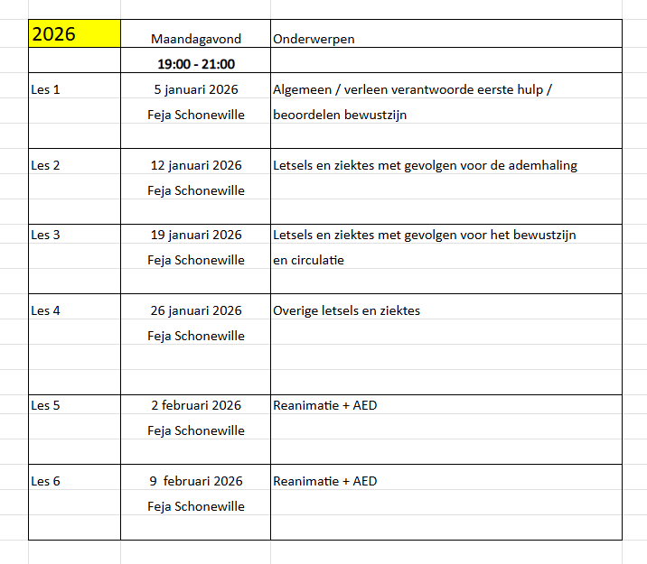 - ๐ Let op: 2 en 9 februari 2026 zijn de Reanimatie & AED-lessen.